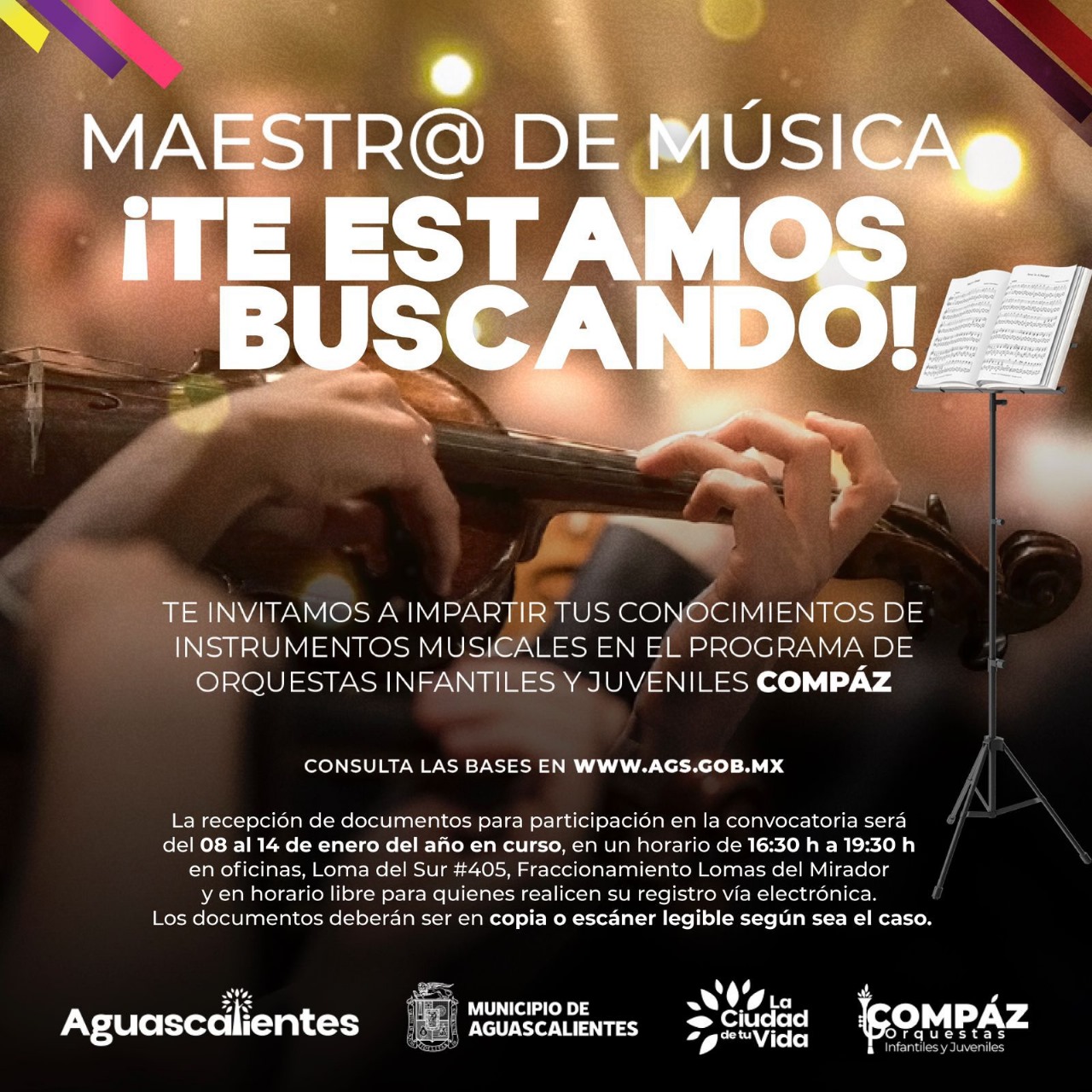 Aguascalienes, Ags. 9 de enero 2024.- Orquestas Infantiles y Juveniles (COMPÁZ) convoca a las y los músicos ejecutantes de trombón, oboe y percusión a participar en las audiciones para selección de talleristas en la enseñanza de los instrumentos ya señalados, bajo las siguientes bases: