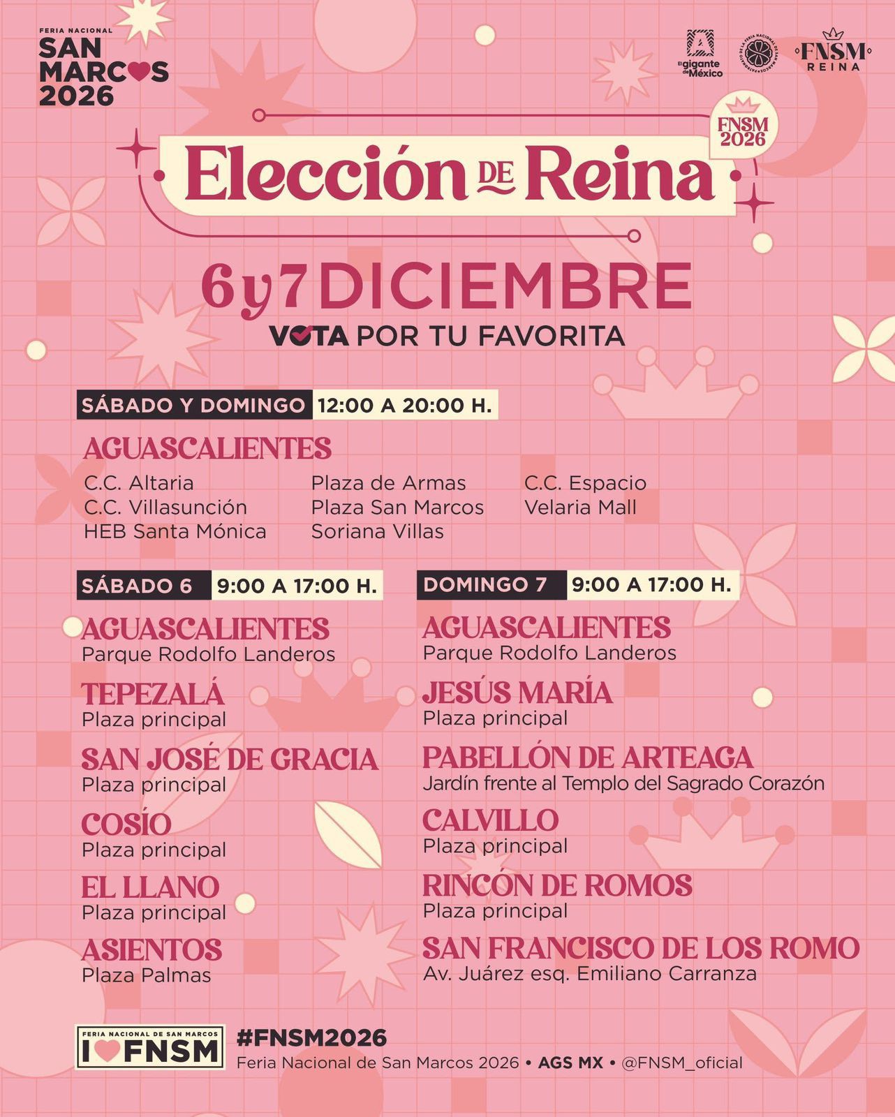 La Secretaría de Comunicación y Voceria del Gobierno del Estado invita a la población para que este 6 y 7 de diciembre participe en las votaciones para elegir a nuestra siguiente Reina de la #FNSM2026 👑